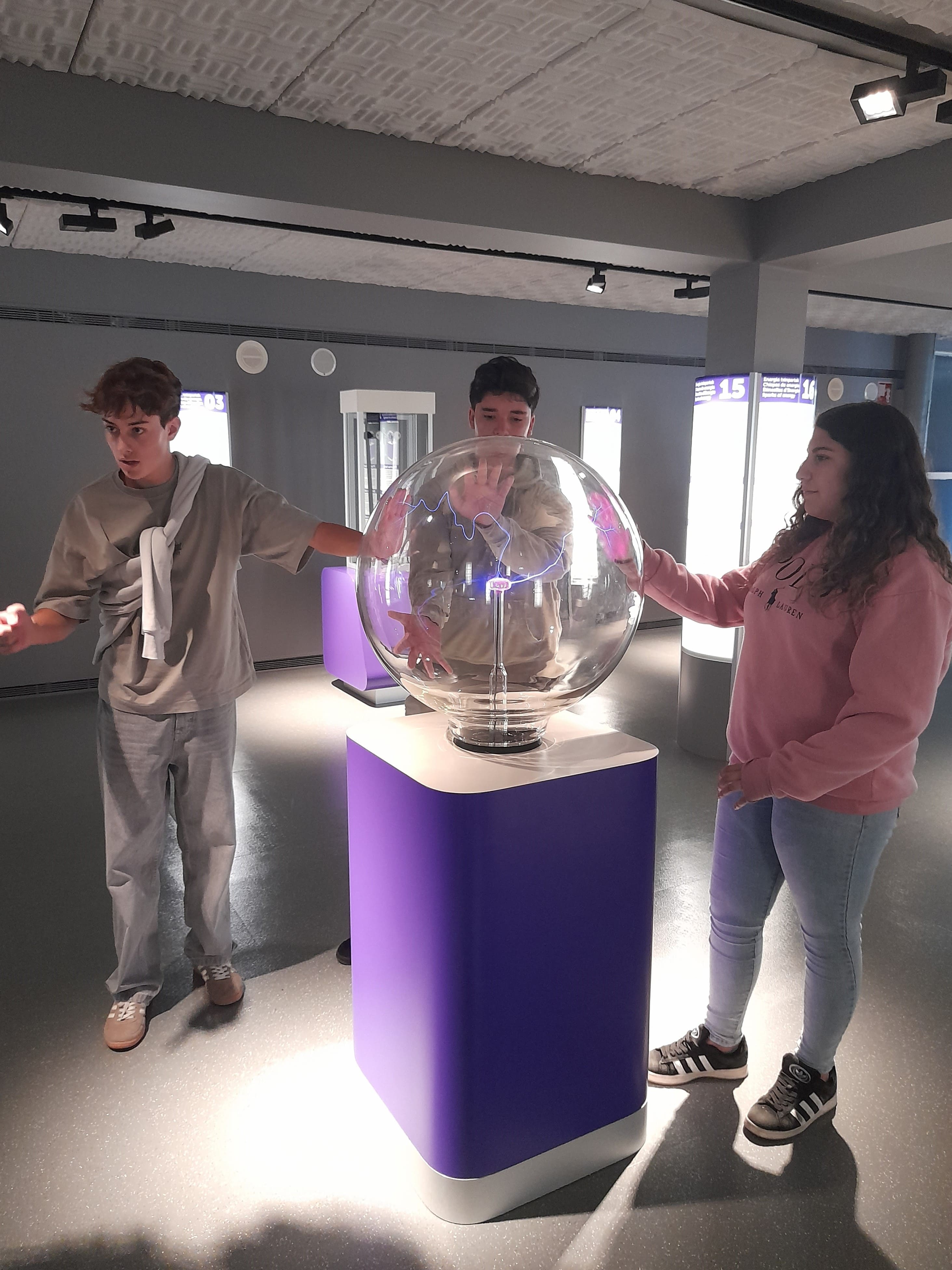Por la mañana realizamos una visita al Museo de la Ciencia ¡Eureka! Comenzamos asistiendo a un taller de electricidad en el que pudimos conocer multitud de fenómenos que, de otra manera, quizás nunca podríamos haber llegado a observar tan de cerca: las propiedades eléctricas de los plasmas, en qué consisten las escaleras de Jacob y los generadores de Van de Graaff, cómo funcionan las jaulas de Faraday y por qué son importantes para nuestra seguridad en el día a día, etc. Algunos de nuestros compañeros incluso se atrevieron a meterse dentro de una de estas jaulas electrificadas. Podría parecer algo peligroso, pero la realidad es que no tenían nada que temer. ¡La física les protegía! Nuestros profesores, sin embargo, no quisieron entrar… ¡A ver si se atreven el año que viene! Tras el taller, visitamos las diferentes salas del museo. Había secciones dedicadas a la electricidad, a la mecánica, a los fluidos, a la óptica, a la anatomía, a la genética, a las matemáticas, a las ilusiones ópticas y a muchas otras cosas más. En todas ellas pudimos aprender algo nuevo mediante el juego y la experimentación, y por eso el tiempo de la visita se nos pasó volando. Para terminar, acudimos al planetario del museo, donde pudimos ver una película sobre astronomía y agujeros negros.
